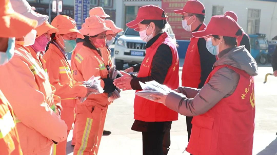 活動(dòng)中,林芝市人社局黨組副書(shū)記、局長(cháng)李培靈同志及黨員干部們?yōu)閲攮h(huán)保林芝分公司一線(xiàn)環(huán)衛工人送來(lái)了絨手套、棉圍脖、保暖帽等物資60套。