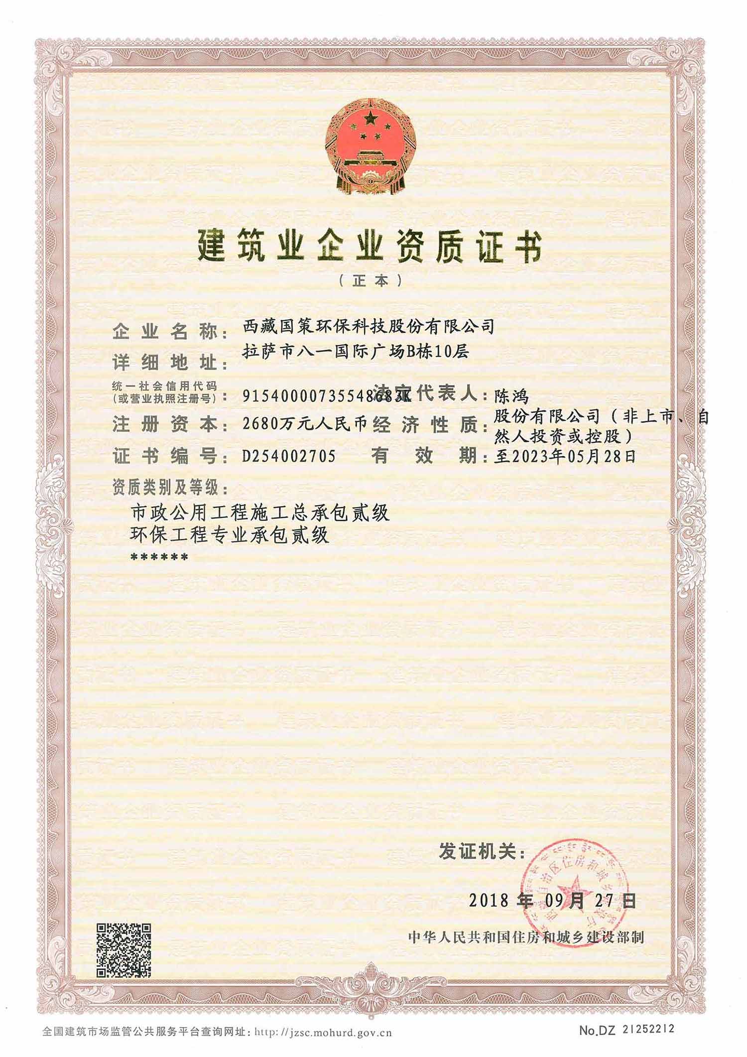 國策環(huán)保擁有住房和城鄉建設部頒發(fā)的建筑業(yè)企業(yè)市政公用工程施工總承包貳級資質(zhì)、環(huán)保工程專(zhuān)業(yè)承包貳級資質(zhì),同時(shí)擁有環(huán)保、市政、機電等各類(lèi)專(zhuān)業(yè)工程技術(shù)人員共計40余人,并先后承擔了眾多污水廠(chǎng)、垃圾填埋場(chǎng)、自來(lái)水廠(chǎng)、醫療廢物處置中心等項目的施工任務(wù)。